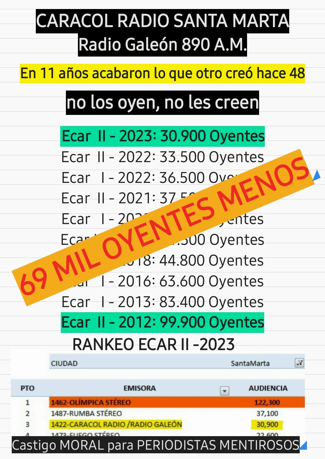 Una reducción de más de 69 mil oyentes, equivalente a una fuga del 70% de su audiencia en 11 años.